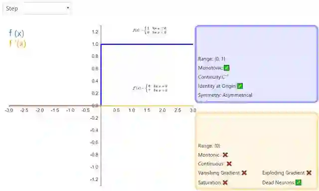激活函数 Step 更倾向于理论而不是实际,它模仿了生物神经元要么全有要么全无的属性。它无法应用于神经网络,因为其导数是 0(除了零点导数无定义以外),这意味着基于梯度的优化方法并不可行。