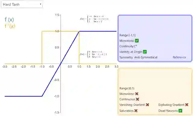 Hard Tanh 是 Tanh 激活函数的线性分段近似。相较而言,它更易计算,这使得学习计算的速度更快,尽管首次派生值为零可能导致静默神经元/过慢的学习速率(详见 ReLU)。