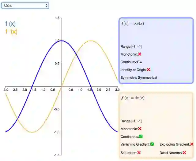 如同正弦函数,余弦激活函数(Cos/Cosine)为神经网络引入了周期性。它的值域为 [-1,1],且导数处处连续。和 Sinusoid 函数不同,余弦函数为不以零点对称的偶函数。