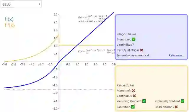 扩展指数线性单元(Scaled Exponential Linear Unit,SELU)是激活函数指数线性单元(ELU)的一个变种。其中λ和α是固定数值(分别为 1.0507 和 1.6726)。这些值背后的推论(零均值/单位方差)构成了自归一化神经网络的基础(SNN)。