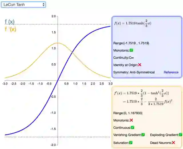 LeCun Tanh(也被称作 Scaled Tanh)是 Tanh 激活函数的扩展版本。它具有以下几个可以改善学习的属性:f(± 1) = ±1;二阶导数在 x=1 最大化;且有效增益接近 1。