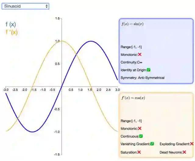 如同余弦函数,Sinusoid(或简单正弦函数)激活函数为神经网络引入了周期性。该函数的值域为 [-1,1],且导数处处连续。此外,Sinusoid 激活函数为零点对称的奇函数。