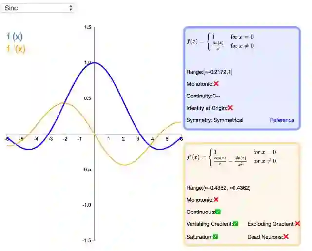Sinc 函数(全称是 Cardinal Sine)在信号处理中尤为重要,因为它表征了矩形函数的傅立叶变换(Fourier transform)。作为一种激活函数,它的优势在于处处可微和对称的特性,不过它比较容易产生梯度消失的问题。