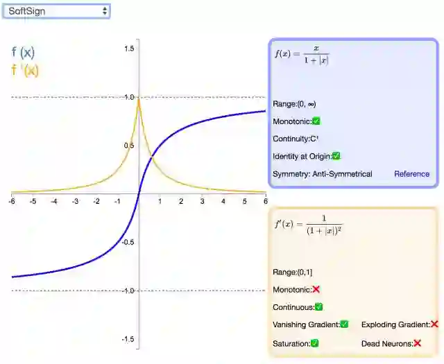 Softsign 是 Tanh 激活函数的另一个替代选择。就像 Tanh 一样,Softsign 是反对称、去中心、可微分,并返回-1 和 1 之间的值。其更平坦的曲线与更慢的下降导数表明它可以更高效地学习。另一方面,导数的计算比 Tanh 更麻烦。