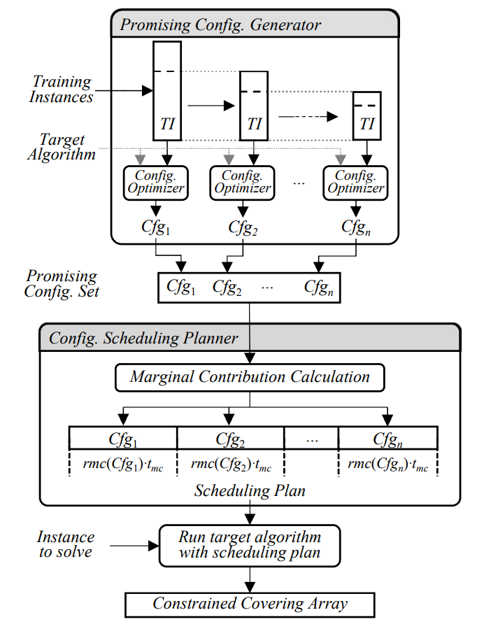 AutoCCAG 的架构如图1所示。给定一个可配置的 CCAG 算法 a,AutoCCAG 的配置优化器会采用自动算法配置技术用于确定算法 a 的优化参数;然后 AutoCCAG 的有效配置生成器的会生成算法 a 的多个配置并且使得这些配置之间有很强的互补性;之后,AutoCCAG 的配置调度规划器会采用自动算法选择技术构造一个关于算法 a 的配置调度规划。最终,AutoCCAG 通过采用该配置调度规划用来求解给定的 CCAG 问题实例,并且生成相应的约束覆盖阵列。