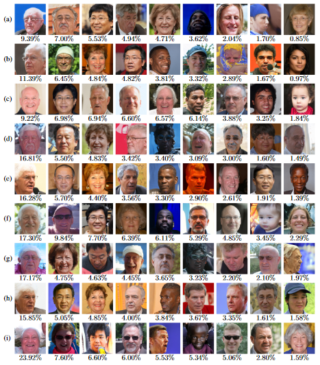 但从以上 9 组图像,我们可以轻易发现一个问题:分数高的 Master face 几乎都是满头白发、不戴眼镜、没有胡须的老年白人男性形象,并且根据分数也可以看出,女性、肤色较深和较年轻的面孔排名较低。