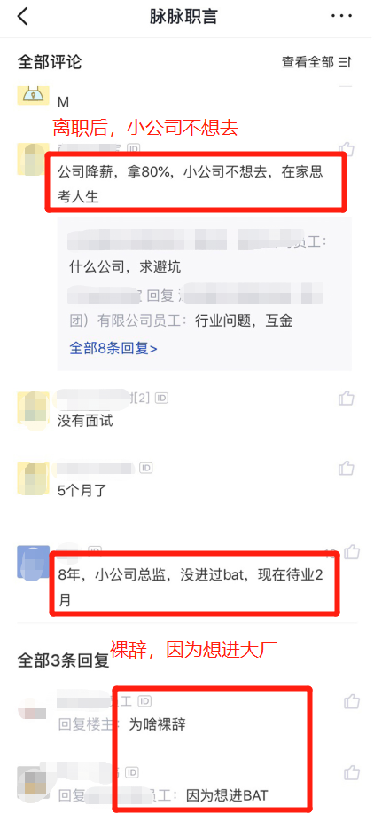 脉脉职业区,大家的互动评论内容也透露着产品人的最后一丝倔强,即使离职/裸辞在家思考人生/待业,也不太愿意考虑抗风险能力弱的小公司。