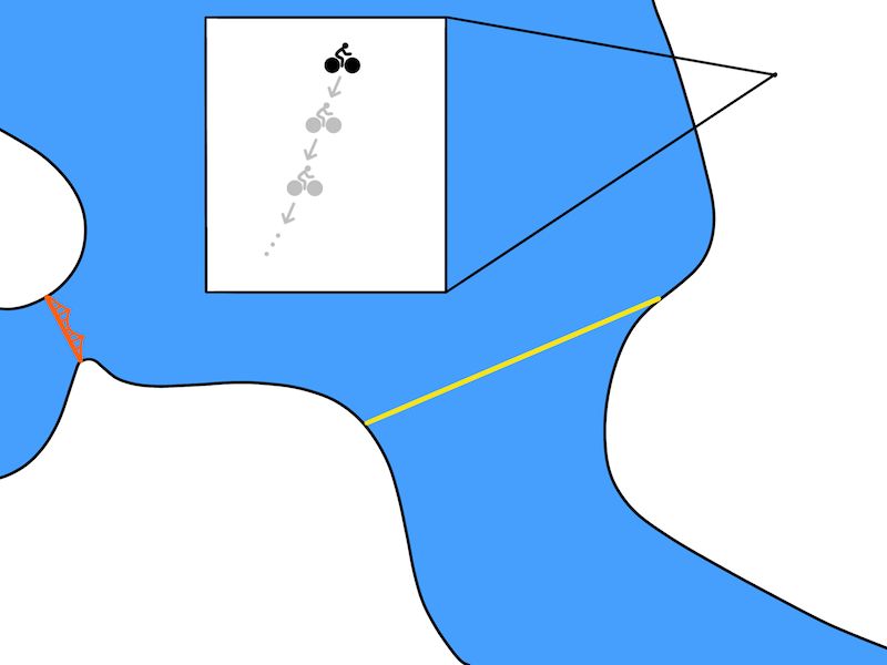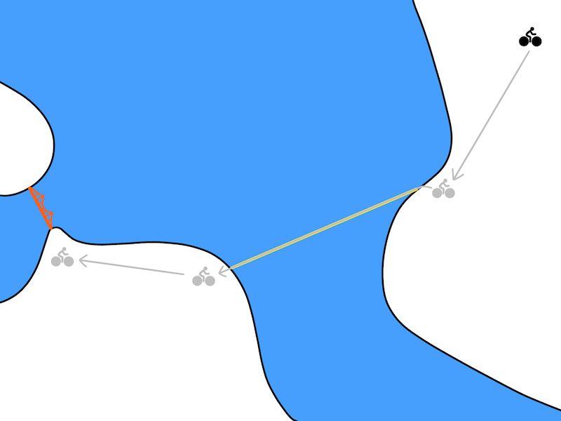在我们的自行车问题中,优化可能会制定从伯克利(图右上)到金门大桥(图左中)的骑行计划,看起来如下图所示: