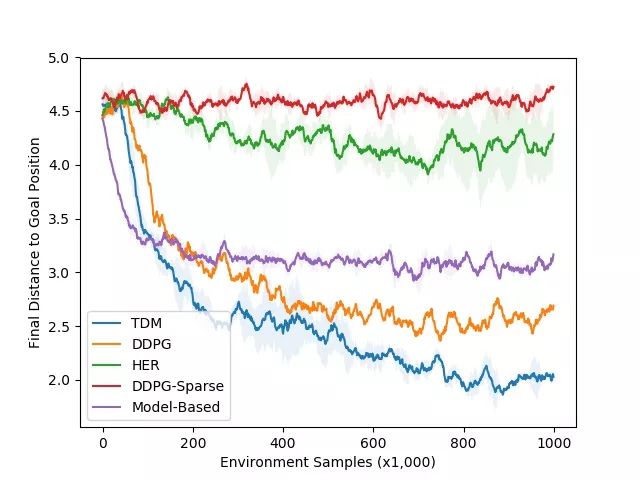 上图所示的学习曲线展示了最终目标的距离与样本的数量直接的关系(越低越好)。我们的仿真以 20Hz 控制机器人,这表示 1000 步对应于现实世界的 50 秒。这种环境的动态相对容易学习,这意味着基于模型的方法应该很出色。正如预期那样,基于模型的方法(紫色曲线)快速学习——大约 3000 步,或 25 分钟——且表现良好。TDM 方法(蓝色曲线)也可以快速学习——大约 2000 步或 17 分钟。无模型的 DDPG(无 TDM)基线最终解决了这个任务,但需要更多的训练样本。TDM 方法能够如此快速学习的一个原因就是它的有效性是基于模型的伪装方法。