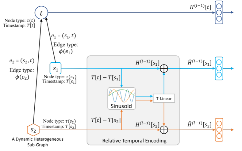 我们计算两两节点相互之间的时间差,并对每一个时间差以一个编码,加在初始节点表征上。这样,在学习过程中,HGT 可以学习出图中的时间依赖关系,同时发生在不同时间的节点间也可以进行信息传递。