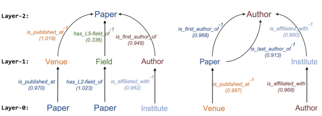 同时,我们还验证了 HGT 可以隐性地抽取出对下游任务重要的元路径,而不需要人为定义。例如下图中的 <paper, is_published_at, venue, is_published_at-1, paper> 路径就有着最高的重要性。