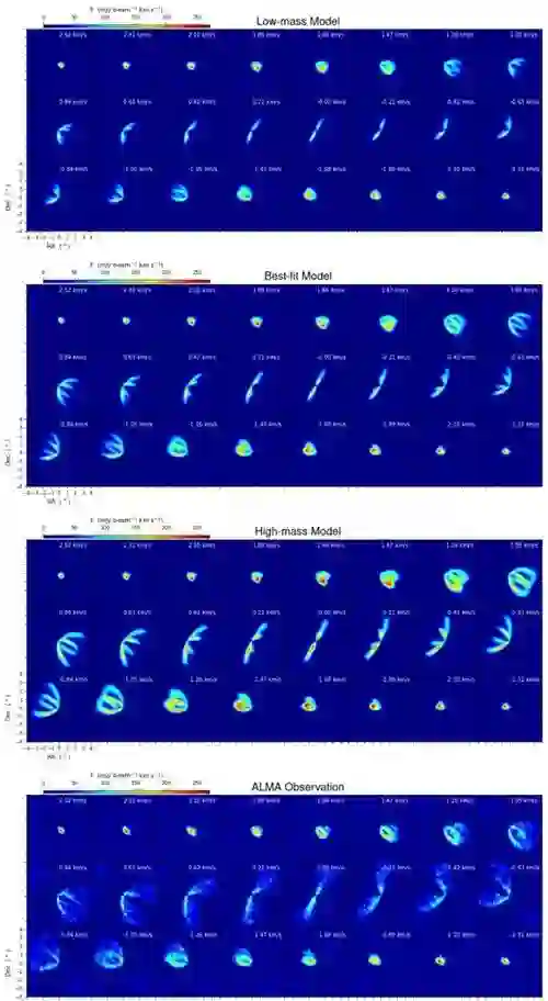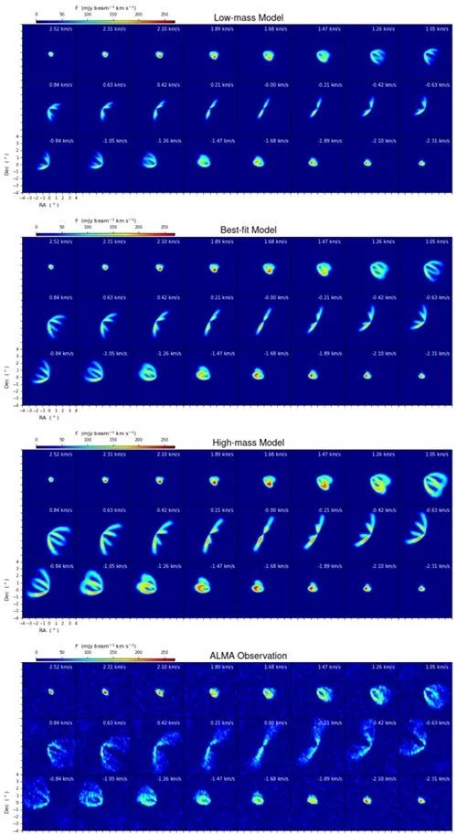 图:不同原行星盘质量下的CO多通道图与ALMA观测对比。从上至下:低质量模型,最佳拟合,高质量模型。