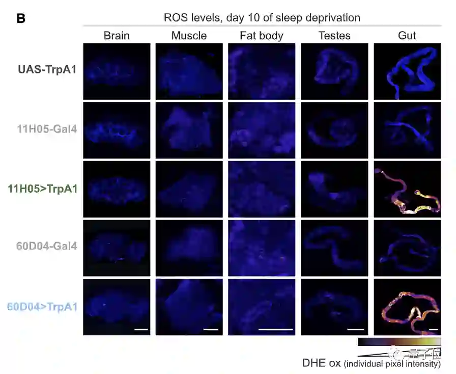 睡眠不足的果蝇肠道中发现了大量的ROS(活性氧簇)堆积。