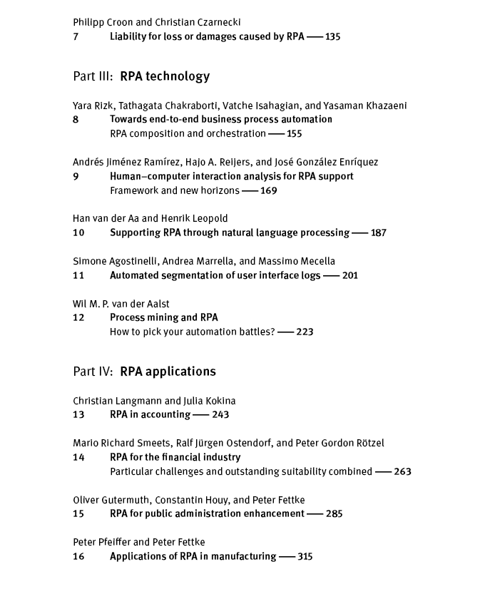 这本书汇集了来自研究和实践的专家。它包括创新机器人过程自动化(RPA)概念的设计,相关研究领域(如人工智能,AI)的讨论,现有软件产品的评估,以及现实生活中实施项目的发现。