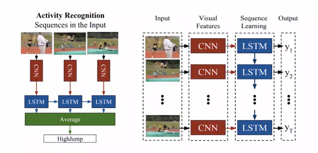 图 5: 左边为面向动作识别的 LRCN。右边为面向所有任务的通用 LRCN 架构。来源(https://arxiv.org/pdf/1411.4389.pdf)