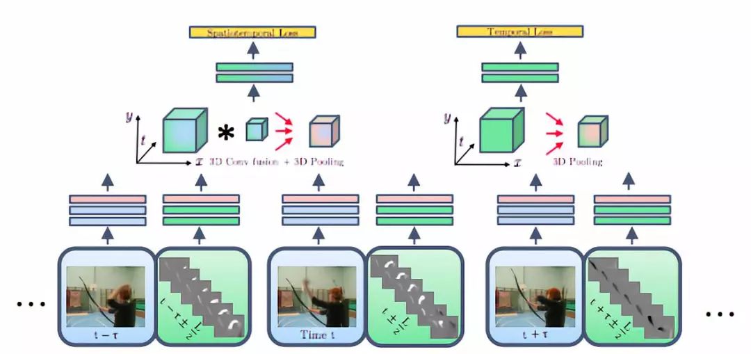 如下图所示,来自两个流的 conv_5 层输出通过 conv+pooling 融合。在最后一层还有另外一次融合。最终融合的输出用于时空损失评估。