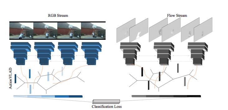 除了 ActionVLAD 层的使用,一切与双流架构都几乎保持相似。作者尝试了多层架构,将 ActionVLAD 层和 late fusion 放在 conv 层之后作为最佳策略。