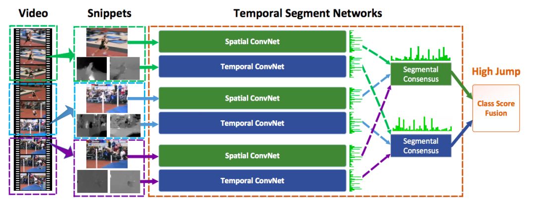 在训练和预测过程中,一个视频被分割成 K 个时间段相同的片段。在那之后,从 K 个片段中随机取样一些片段。其余步骤与双流构架相似,除了上述的一些变化。