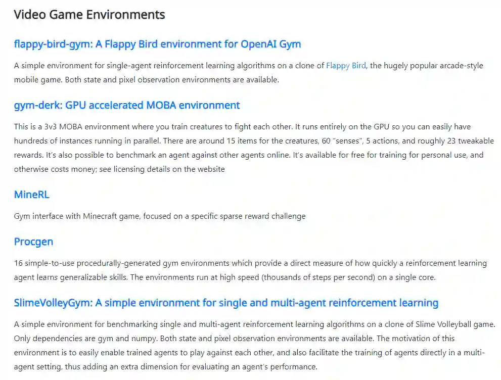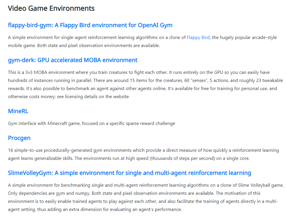 其中Gym以界面简单、pythonic,并且能够表示一般的 RL 问题,而在强化学习领域非常知名。