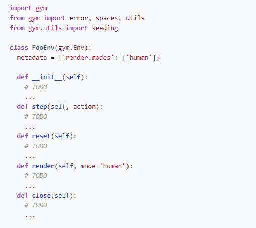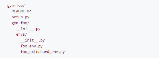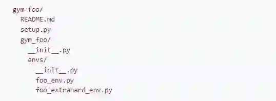 这是包含自定义环境的 Python 包的存储库结构的简单骨架。更完整的例子请参考:https://github.com/openai/gym-soccer。