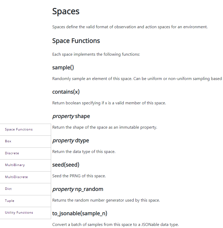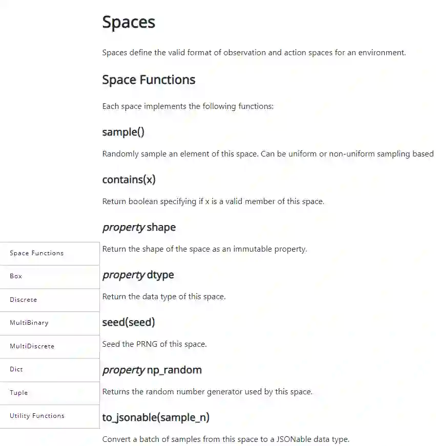 Space主要定义了环境的观察和行动空间的有效格式。包含了Seed函数、Sample等各种各样的函数接口:
