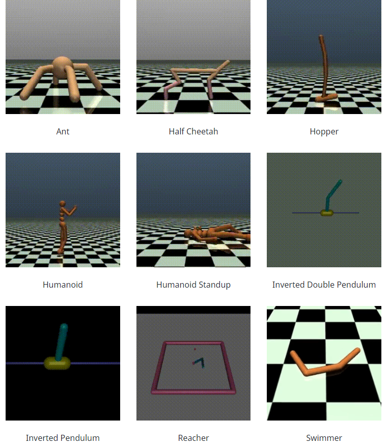 有十个 Mujoco 环境:Ant、HalfCheetah、Hopper、Hupper、Humanoid、HumanoidStandup、IvertedDoublePendulum、InvertedPendulum、Reacher、Swimmer 和 Walker。所有这些环境的初始状态都是随机的,为了增加随机性,将高斯噪声添加到固定的初始状态。Gym 中 MuJoCo 环境的状态空间由两个部分组成,它们被展平并连接在一起:身体部位 ('mujoco-py.mjsim.qpos') 或关节的位置及其对应的速度 ('mujoco-py.mjsim. qvel')。通常,状态空间中会省略一些第一个位置元素,因为奖励是根据它们的值计算的,留给算法间接推断这些隐藏值。