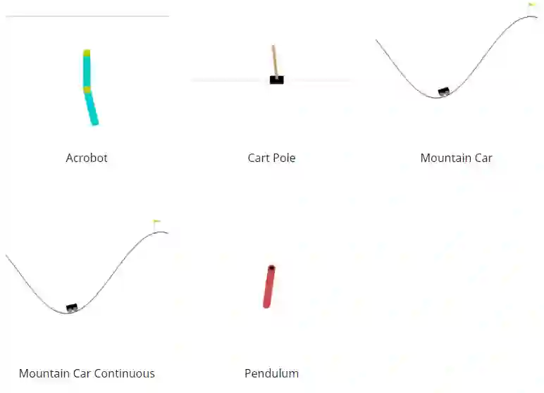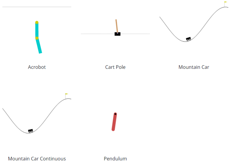 有五种经典控制环境:Acrobot、CartPole、Mountain Car、Continuous Mountain Car 和 Pendulum。所有这些环境在给定范围内的初始状态都是随机的。此外,Acrobot 已将噪声应用于所采取的操作。另外,对于这两种山地车环境,爬山的车都动力不足,所以要爬到山顶需要一些努力。在 Gym 环境中,这组环境可以被认为是更容易通过策略解决的环境。所有环境都可以通过每个环境文档中指定的参数进行高度配置。