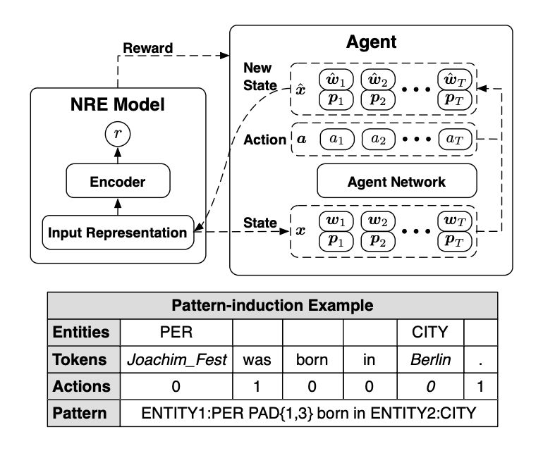 模式抽取部分的核心想法是通过强化学习训练一个代理网络(Agent Network)来获得关系相关的模式。