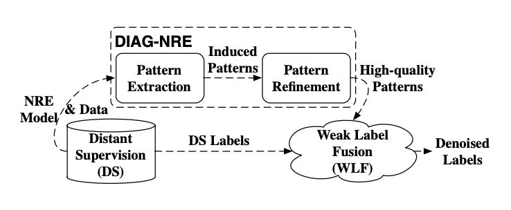 基于这些观察,我们提出了一套神经模式诊断框架(DIAG-NRE)来桥接远程监督与弱监督融合,其大体流程如下图所示。