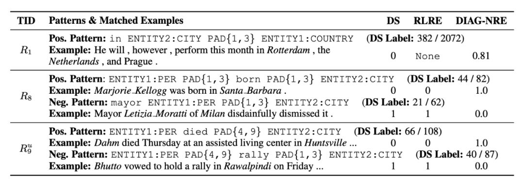 其他的关系类型也或多或少存在类似的错误标签,然而无人工干预的自动调整方法并不能有效抑制这样的标签噪声,同时只加入少量人工纠正过的正确标签也难以覆盖到海量的噪声样本。与之相比,DIAG-NRE 辅助生成高置信度较高覆盖率的模式,再结合弱监督融合机制,从而高效地以可解释的方式减少标签噪声。