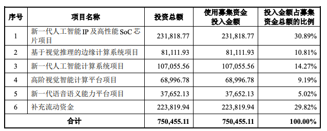 招股书显示,本次募资将主要用来投入芯片相关技术和产品的研发。其中有23.18亿元用于新一代人工智能IP及高性能SoC芯片项目,8.11亿元用于基于视觉推理的边缘计算系统项目,10.7亿元用于新一代人工智能计算系统项目。
