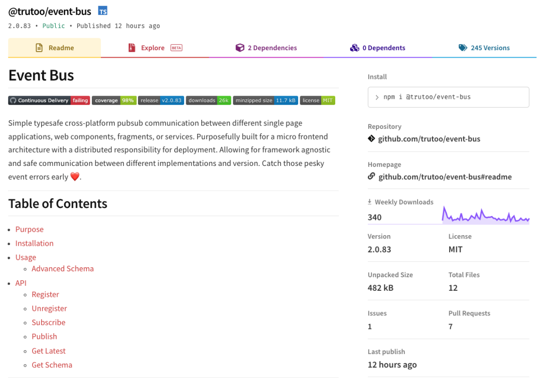 我在我关注的众多 Slack 频道中发现了这个事件总线库,毫无疑问,它非常有助于在松耦合的元素(微前端,但不限于此)之间实现更结构化的通信:https://www.npmjs.com/package/@trutoo/event-bus