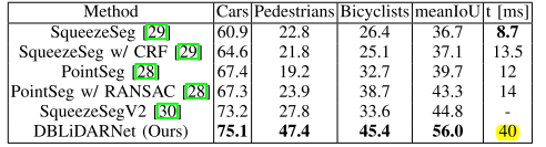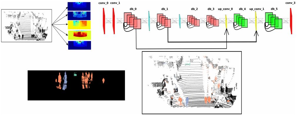 1、提出了一个卷积神经网络架构用于3D激光雷达的语义分割,分割类别为车,人和骑车的人;