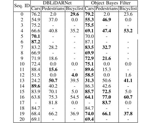 了解环境的语义特征是机器人自主运行的关键因素。在本文中,作者提出了一种深度卷积神经网络(DCNN),用于将LiDAR扫描数据语义分割为汽车,行人或骑车的人。该架构基于dense blocks,并有效利用深度可分离卷积来限制参数数量,同时仍能保持最先进的性能。为了使DCNN的预测在时间上一致,作者提出了一种基于贝叶斯滤波的方法。该方法使用神经网络的预测输出来递归地估计扫描数据中的点的当前语义状态。该递归估计使用从先前扫描获得的知识,从而使得预测在时间上一致并且对孤立的错误预测具有鲁棒性。作者将提出的架构性能与其他最先进的神经网络架构进行了比较,并提出了实质性的改进。对于所提出的贝叶斯滤波器方法,作者在KITTI跟踪基准测试中展示了各种序列的结果。