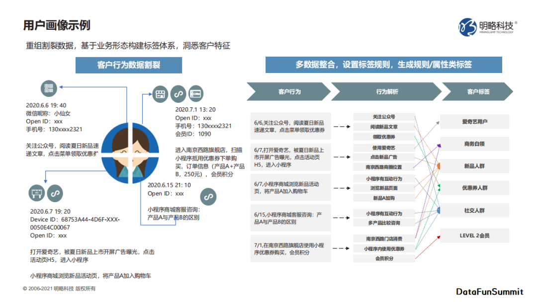最后结合我们的用户画像产品,举一个简单的例子。当今很多企业可能会有多个触点来获得用户行为,在左边的图中,有四个触点,因此形成的用户的多个碎片化的信息:可能是关注了公众号,通过一次广告点击进入到了活动主页,然后在小程序里面进行了一些咨询,最后线下购买。我们通过不同渠道,获得了用户的行为。当我们把这些行为串联起来去看的时候,可以直接从行为中提取一些事实标签,例如关注了公众号,那就是“xx公众号的读者“,使用爱奇艺,可能是“xxAPP的使用者”,关注了新品,因此是“xx新品的关注者”,这些都是比较直观的解析。通过这些直观的解析,再经过模型的计算,我们就可以得到一些深层次的标签,例如,商务白领。怎么推断出来的?用户在南京西路商圈活动,同时还在这个地方消费。假如用户只是去看一看,不买,我们可能也推断不出来,但用户既在附近活动,又消费,我们就能做一个推断,用户是一个商务白领等等。结合这种行为解析,就可以产生高层次标签。