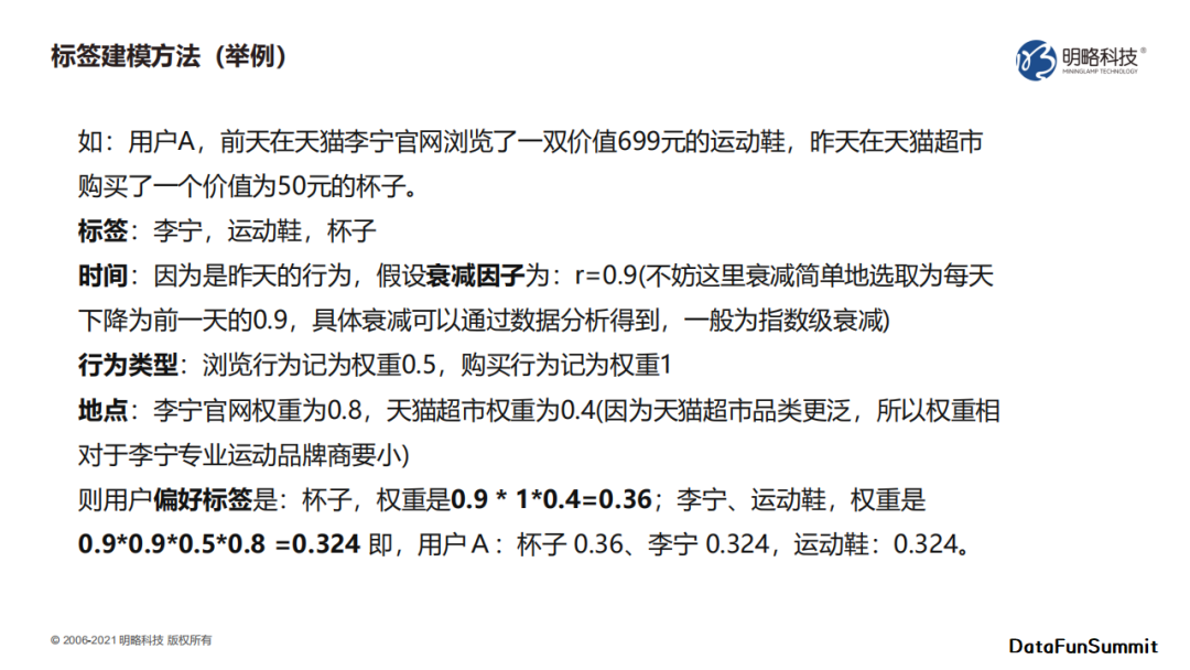 对于行为类型的标签,不同行为权重不同,比如购买行为权重是1,浏览权重只是0.5,也可能引入地点的权重,例如品牌官网的权重可能会重一些,天猫超市可能稍微低一些。