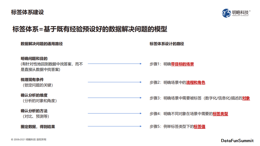 以上五步,就是用数据去解决问题的通用途径。制定标签体系设计路径的时候,也是类比通用路径,因此也有五个步骤。