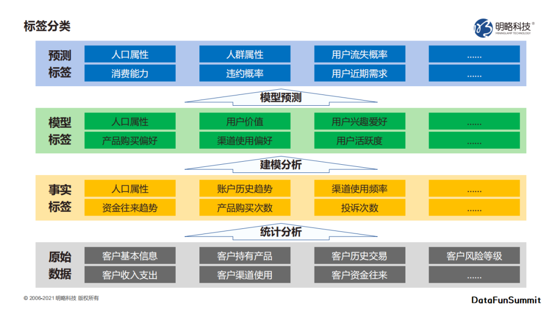 底层:其实不是标签,而是原始数据,是我们通过数据在线从各个渠道中采集汇聚回来的数据,通过这些数据进行简单的分析就可以得到第一类标签-事实标签。