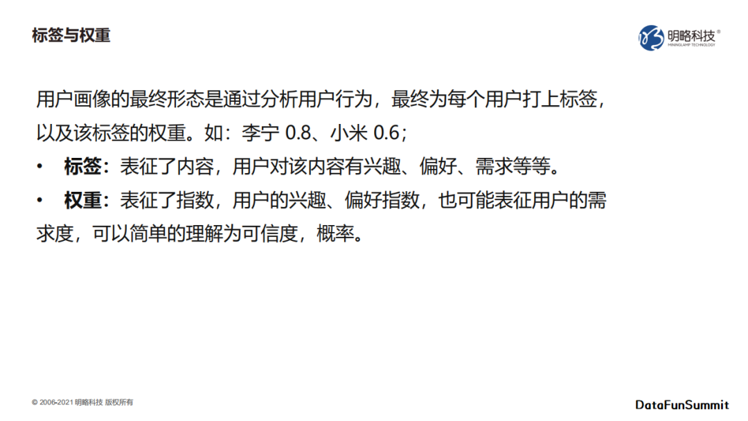 以这两个标签为例:李宁0.8,小米0.6。标签的部分,表征用户对哪些内容有兴趣、爱好或者需求,权重则表征了爱好或者需求的指数,也可能是需求度、可信度、概率等。