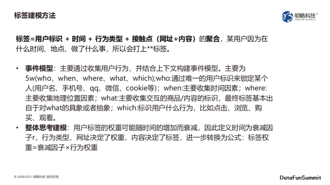 下面对标签建模方法做进一步讨论。标签是对用户标识、时间、行为类型、接触点(网址、内容)的聚合,即,因为用户在什么时间什么地点干了什么事,所以我们才需要给用户打上一个某某标签。进一步的,从整体思考和建模,可能需要加入权重方面的设计。例如,在某些场景下,我们需要定义时间衰减因子,即时间越长,可能性或者说概率就越低,权重也就越低。