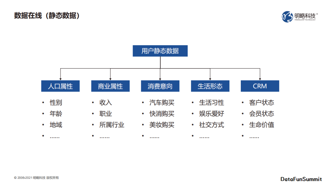 动态数据是用户不断变化的行为信息。我们可能会更多地聚焦在用户在互联网上的行为,比如在浏览了某品牌的网页,浏览了某一个品类的一个单品页,或是发了一条微博等等这些信息,这种就是动态数据。
