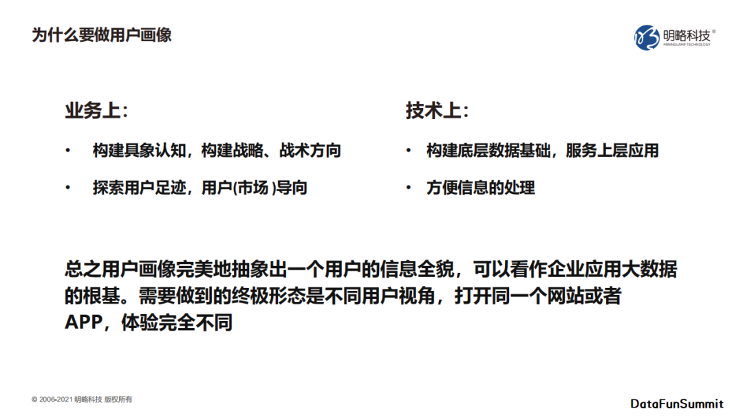在业务层面,我们通过用户画像可以去构建具象的认知,构建战略和战术方向,同时也可以去探索用户足迹,形成以用户为导向的一个方向。在对核心用户达成统一而且具象的认识之后,我们后续的投入才能方向明确,有的放矢。