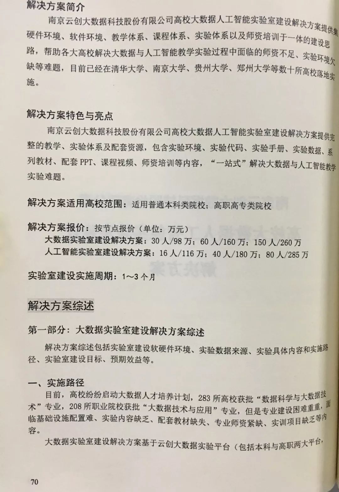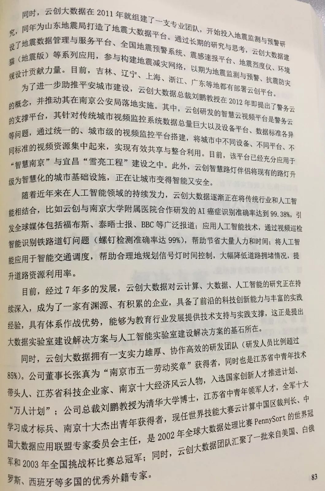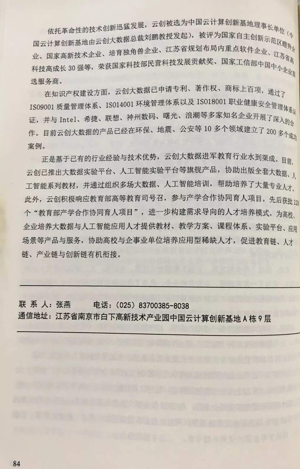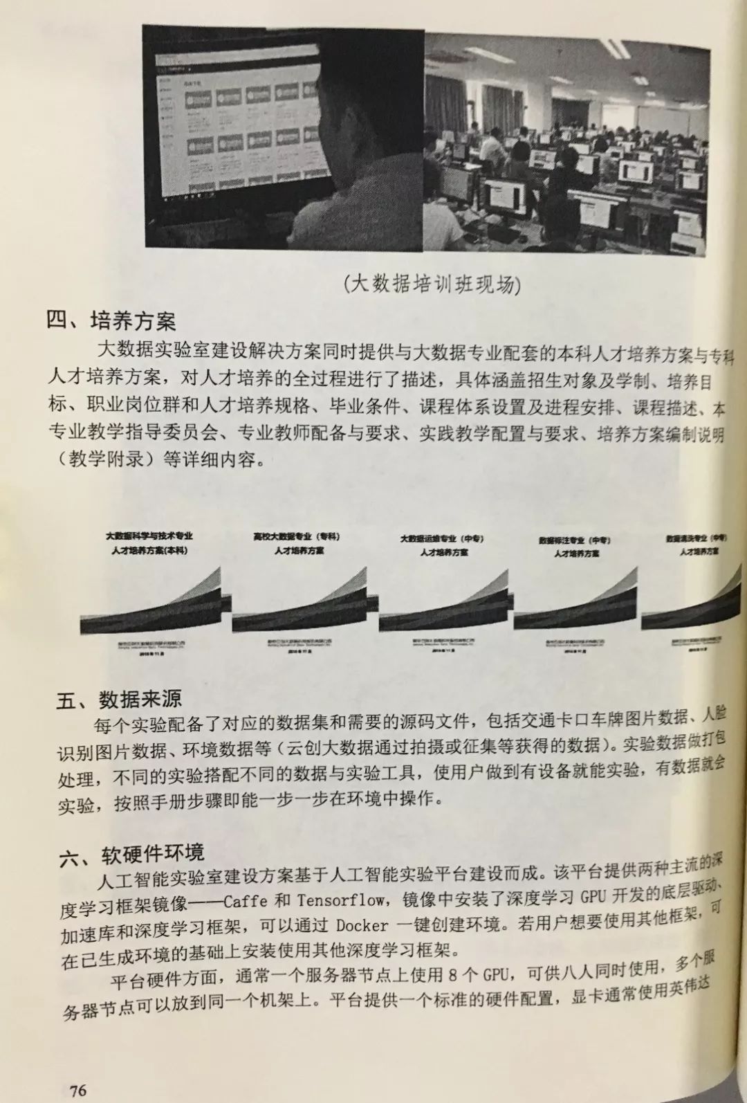 《选型采购指南》全书共分领导篇、院士篇、专家篇、方案篇、政策篇、专业篇6个篇章。在方案篇中,云创大数据提供的高校大数据与人工智能实验室建设解决方案得以亮相。该方案提供集硬件环境、软件环境、教学体系、课程体系、实验体系以及师资培训于一体的建设思路,可以帮助各大高校解决大数据与人工智能教学实验过程中面临的师资不足、实验环境欠缺等难题。