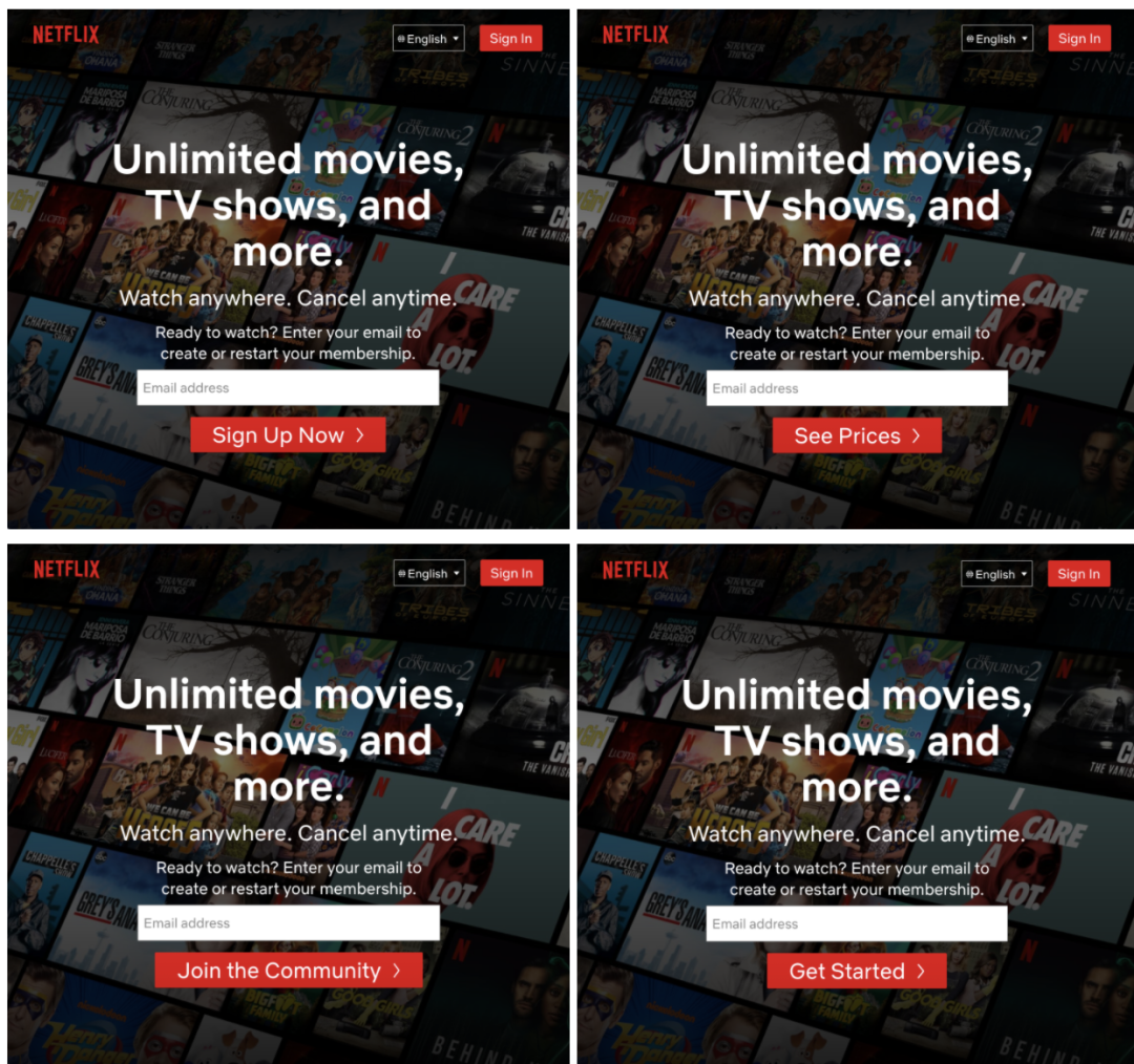Netflix非常喜欢A/B测试的内容。这是他们在主页上测试的CTA的4种变化(图源自Netflix技术博客)