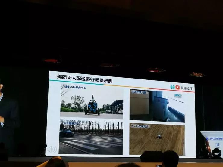 右下方展示的是我们早期的一个配送无人机,这个无人机是在北京北六环以外的一个测试场里飞行,它下面带着一个白色盒子就是我们的餐箱,所以它可以自动地从一个地方飞到指定目的地,然后把餐箱送到用户所在机场,在机场我们会有一定装置,把餐箱送到用户手上。