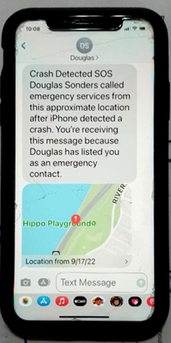 与此同时,iPhone 的碰撞检测被触发,不仅报了警,还给他所有的紧急联系人发了短信。