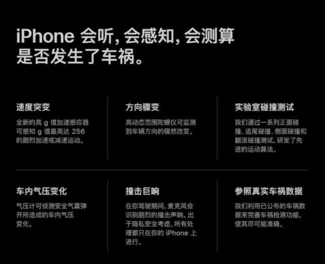 苹果称,车祸检测功能基于10亿小时的机器学习训练,并借助加速度传感器、陀螺仪、麦克风等多种传感器来感知四种碰撞场景,包括正面、侧面、追尾和翻车。