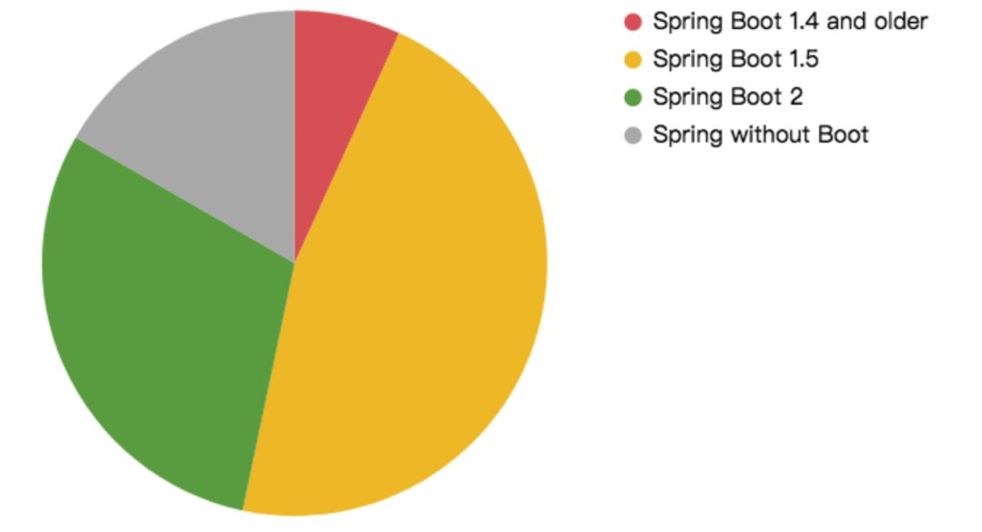 Spring 2 的占比上升很迅速,已经占到了30%!Boot 1.4 以及更老的版本由去年的 30% 降为 6.8%。