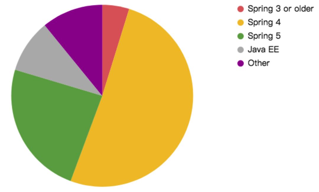 很多开发者,正在向 Spring 5 进行迁移,Spring 5 的比例有去年的百分之 2.2 上升到今年的百分之 24,这是一个明显的趋势!