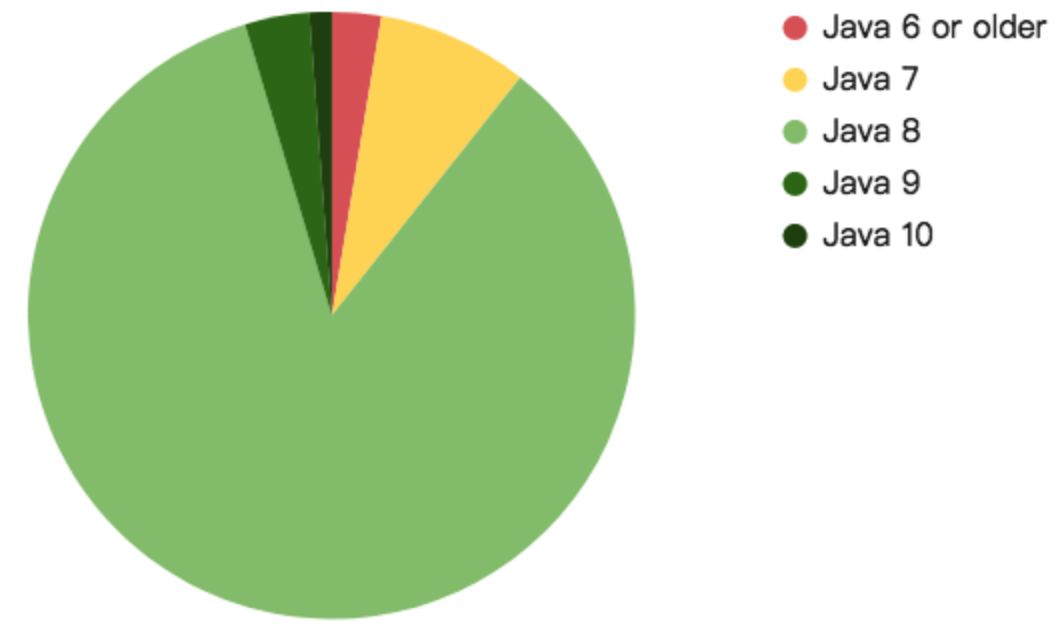 Java 9 和 Java 10 的使用率非常低,不到 5%。2017 年,Java 7 和更早的版本的数量大约是 24.4%,现在是 10.6%——所以生态系统显然正在升级,主要是升级到 Java 8。